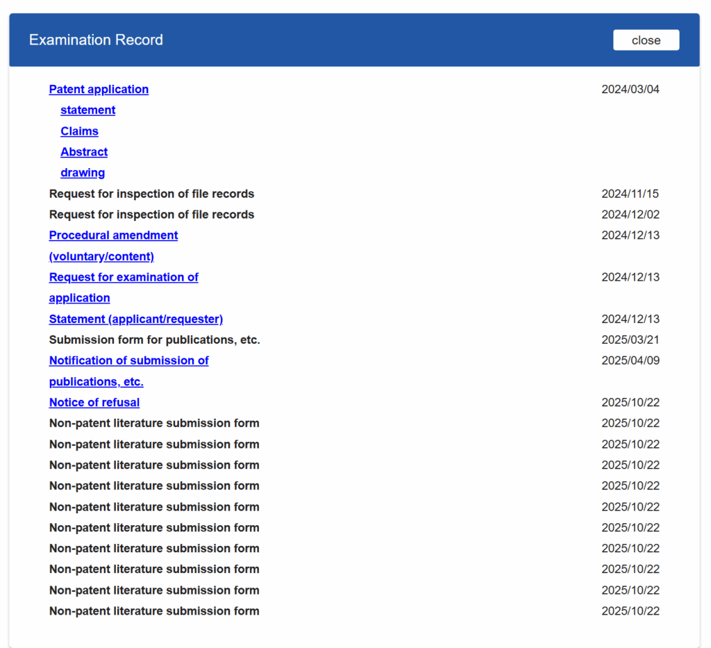 Here’s a screenshot of the examination record. It shows an April 9, 2025 “notification of submission of publications” and an October 22, 2025 notice of refusal: